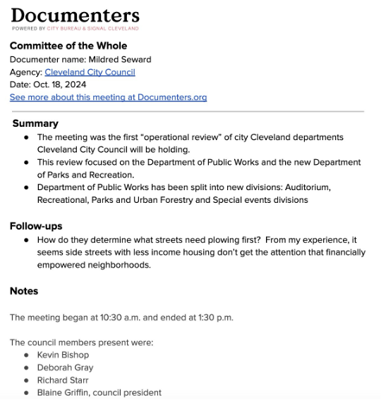 Figure 1: Example of Documenters notes from a Cleveland City Council meeting, October 18, 2024.