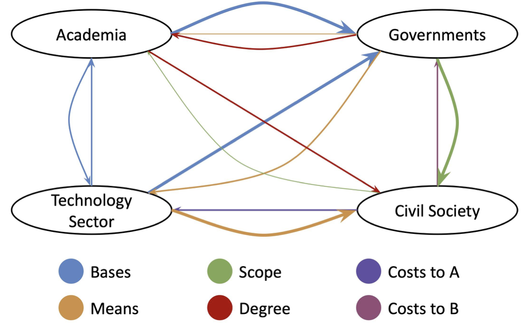 Figure 2: Example diagram visualizing the potential output of the AI PDI. The nodes/circles represent major AI actor groups. The arrows between each pair of actors A and B represent the power relationship between the two actors. The arrow direction A → B represents A’s power over B. The color of the arrow represents the dominant dimension of power. The thickness of the arrow represents the strength of that dimension of power, with thicker arrows indicating more strength. Note that this is only an illustrative diagram; The final index could divide the ‘Technology Sector’ node into 10 different nodes, for example with each representing a salient actor in the technology sector.