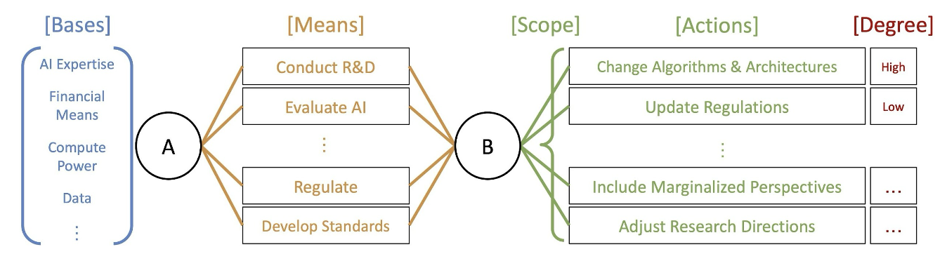 - A’s means of exploiting their bases to affect B. These are the different ways A can attempt to influence B. For example, in the context of AI power dynamics, A could represent a national government, which can pass laws (the means) that force B, a technology company, to take certain actions.